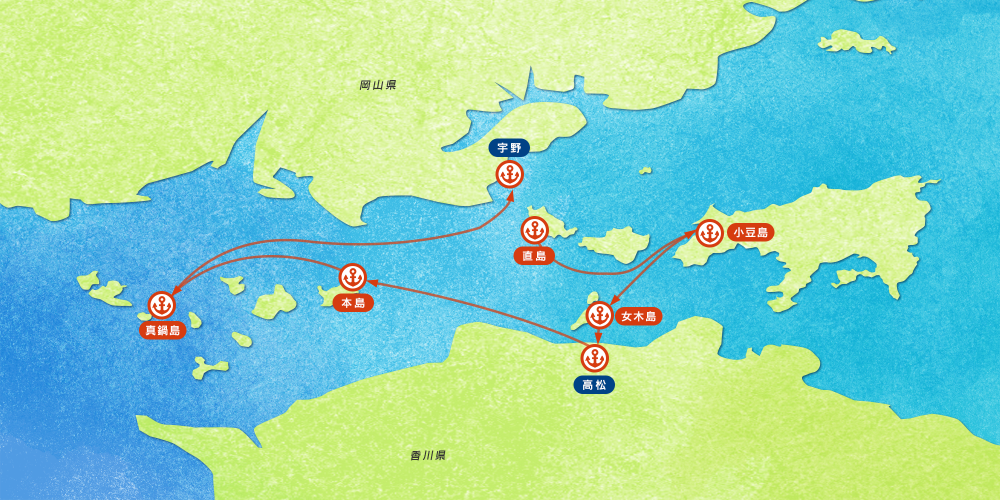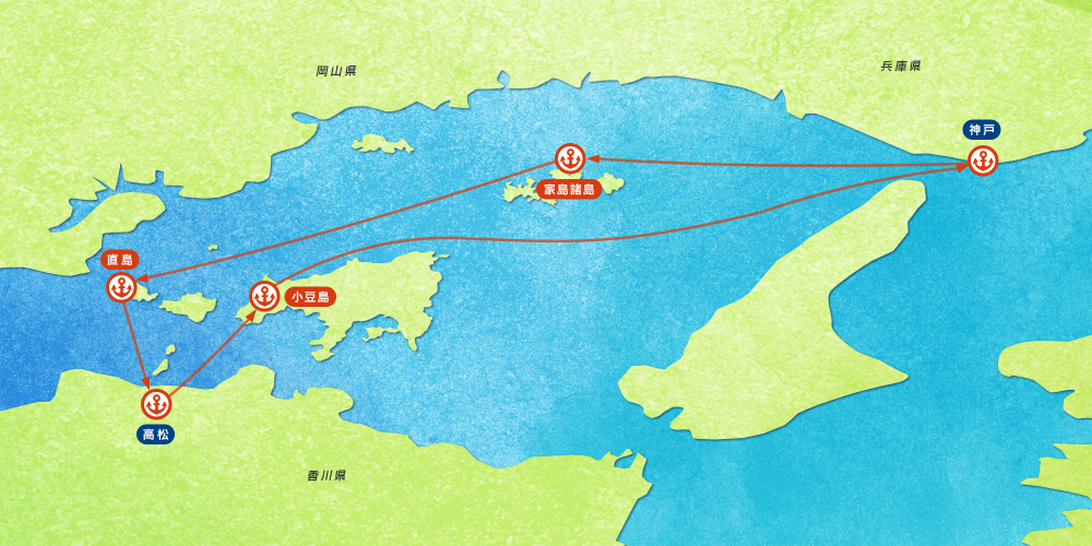 Nous avons le plaisir de vous présenter un exemple de parcours où vous pourrez profiter de la mer intérieure de Seto. Cependant, comme la mer intérieure de Seto est parsemée de plus de 700 îles, il est impossible de visiter toutes les îles. Les travel designers peuvent vous aider à créer votre propre plan de voyage, en fonction de vos intérêts et des jours de location. L'île que vous souhaitez visiter, le nombre de jours d'affrètement, la distance et le temps de voyage, à vous de choisir votre temps de croisière plus ou moins long si vous souhaitez passer plus de temps sur les îles. Faites nous part de vos intérêts quant à l’art contemporain, les goûts régionaux, la baignade en mer, la visite de vieilles villes, etc…), l’expérience de la croisière en voilier !